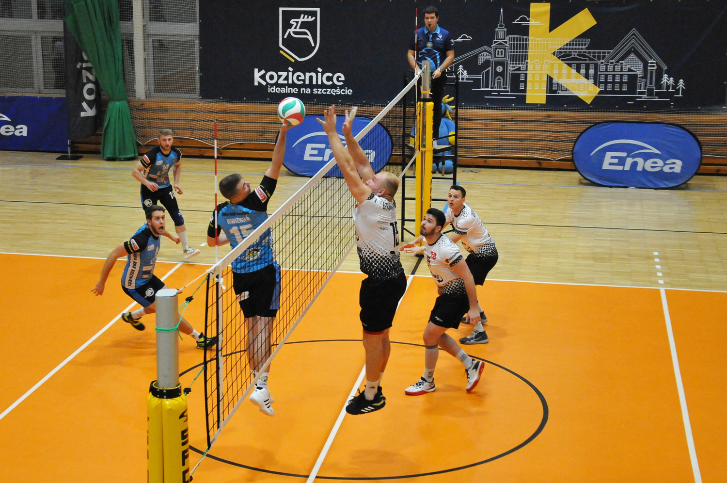Początek spotkania to prawdziwa symfonia w wykonaniu naszych graczy. Dokładne ataki posyłali bracia Korycińscy i Kacper Kędra, a Wojtek Kwiecień dorzucił skuteczną kiwkę. KKS szybko złapał trzypunktowe prowadzenie. Nasza gra wyglądała świetnie – odrzucaliśmy rywali od siatki, przez co mieli utrudnione rozegranie, a z drugiej strony bardzo dobrze funkcjonowały nasze przyjęcie, rozegranie i atak. Widać było pełne skupienie w kozienickiej drużynie, a założony plan był wdrażany perfekcyjnie. Przynajmniej do czasu pierwszych kontrowersyjnych decyzji sędziego. Arbiter w pierwszej partii kilkukrotnie pomylił się na korzyść gości (na szczęście mylił się głównie w pierwszej odsłonie). Kilka nietrafionych decyzji przełożyło się na lekki chaos w naszych szeregach. Mimo to, KKS punktował. Przy stanie 11:8 Kędra posłał asa, kilka chwil później kolejnego dołożył Obremski i było 15:10, a za chwilę 19:12.